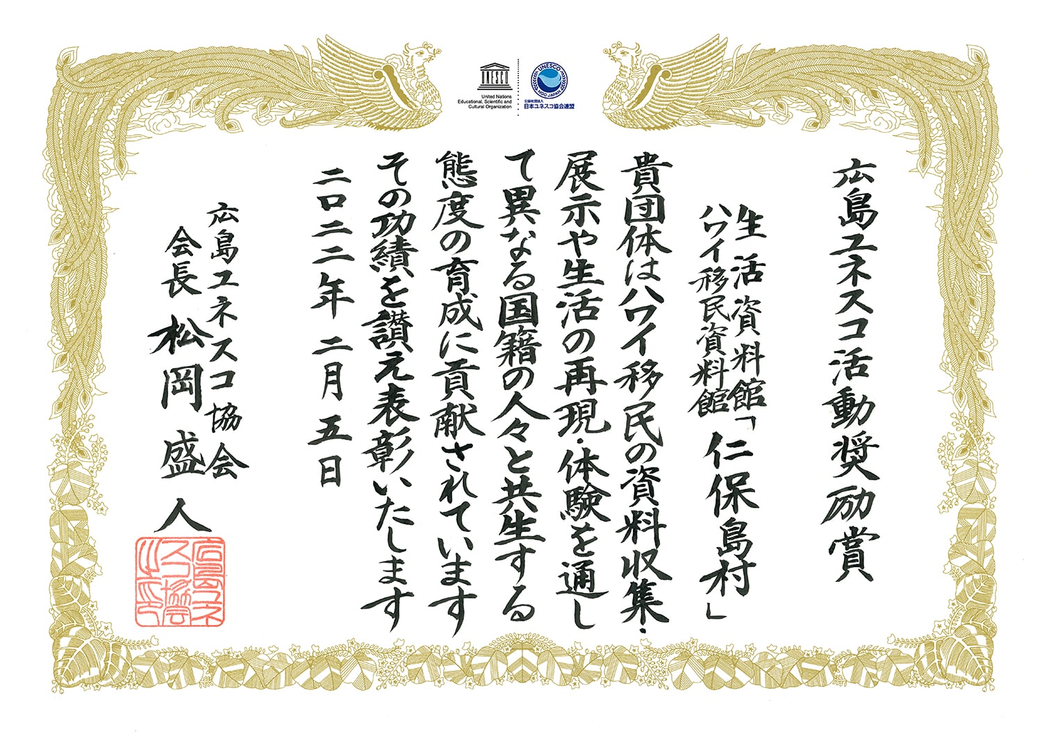 令和4年2月5日 広島ユネスコ協会から第24回活動奨励賞を戴きました。コロナまん延防止のため今回の授賞式は中止。