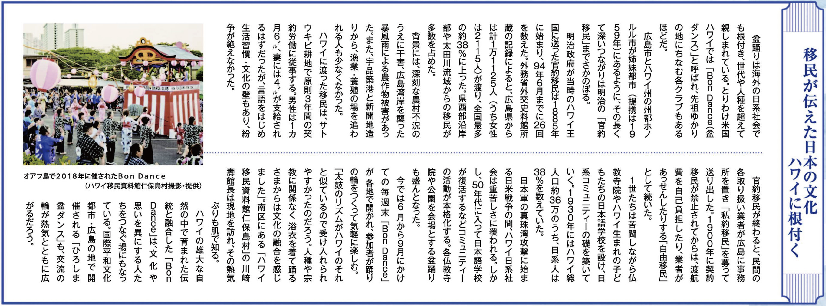 我が仁保島村の最後の岩澤村長は、「おらが村さの誇りのものは、海外移民と盆踊り」と、仁保村志に書き記した。